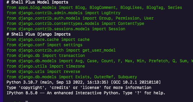 We can configure Shell plus to use to use either ipython, bpython, ptpython or plain shell. In the settings.py add the following below: